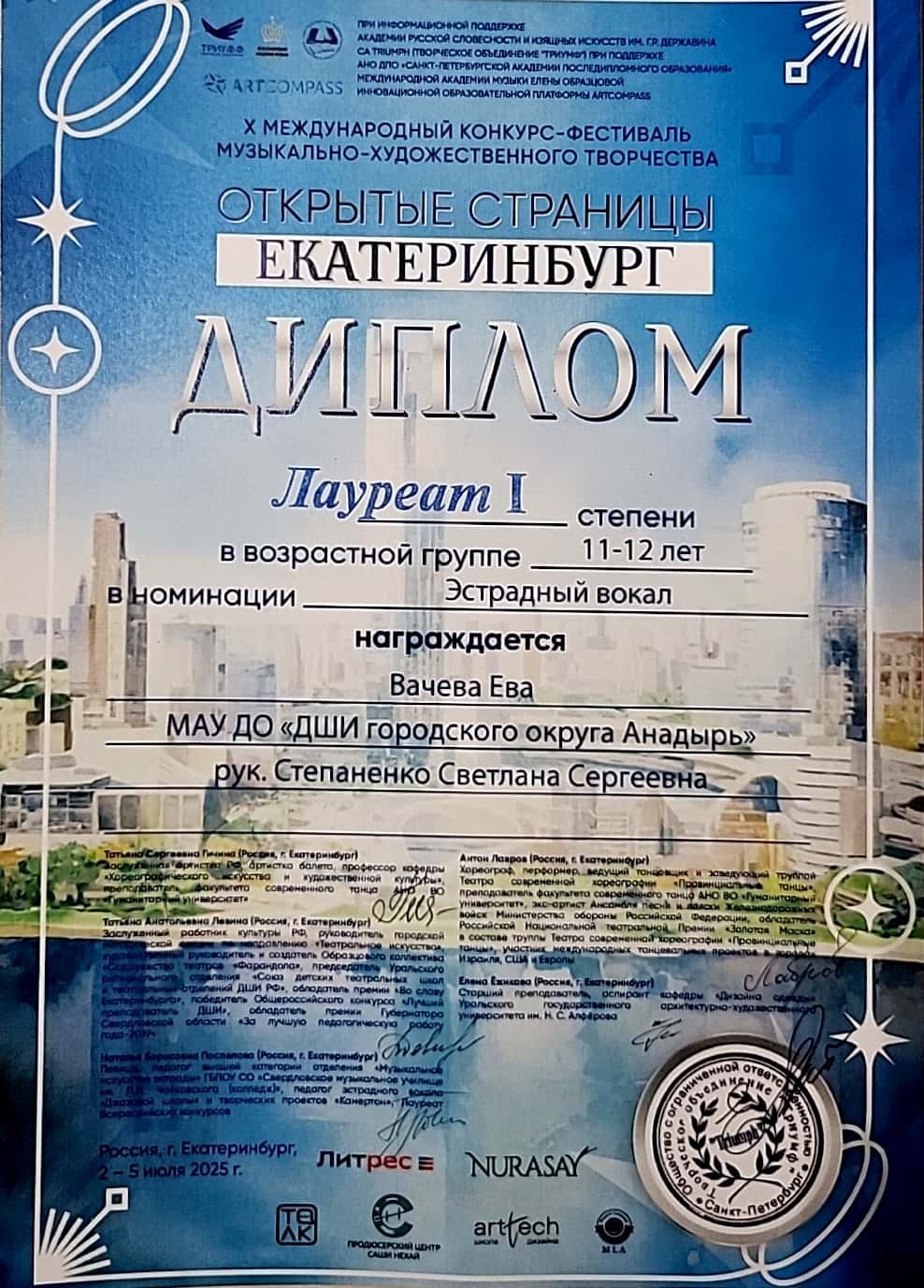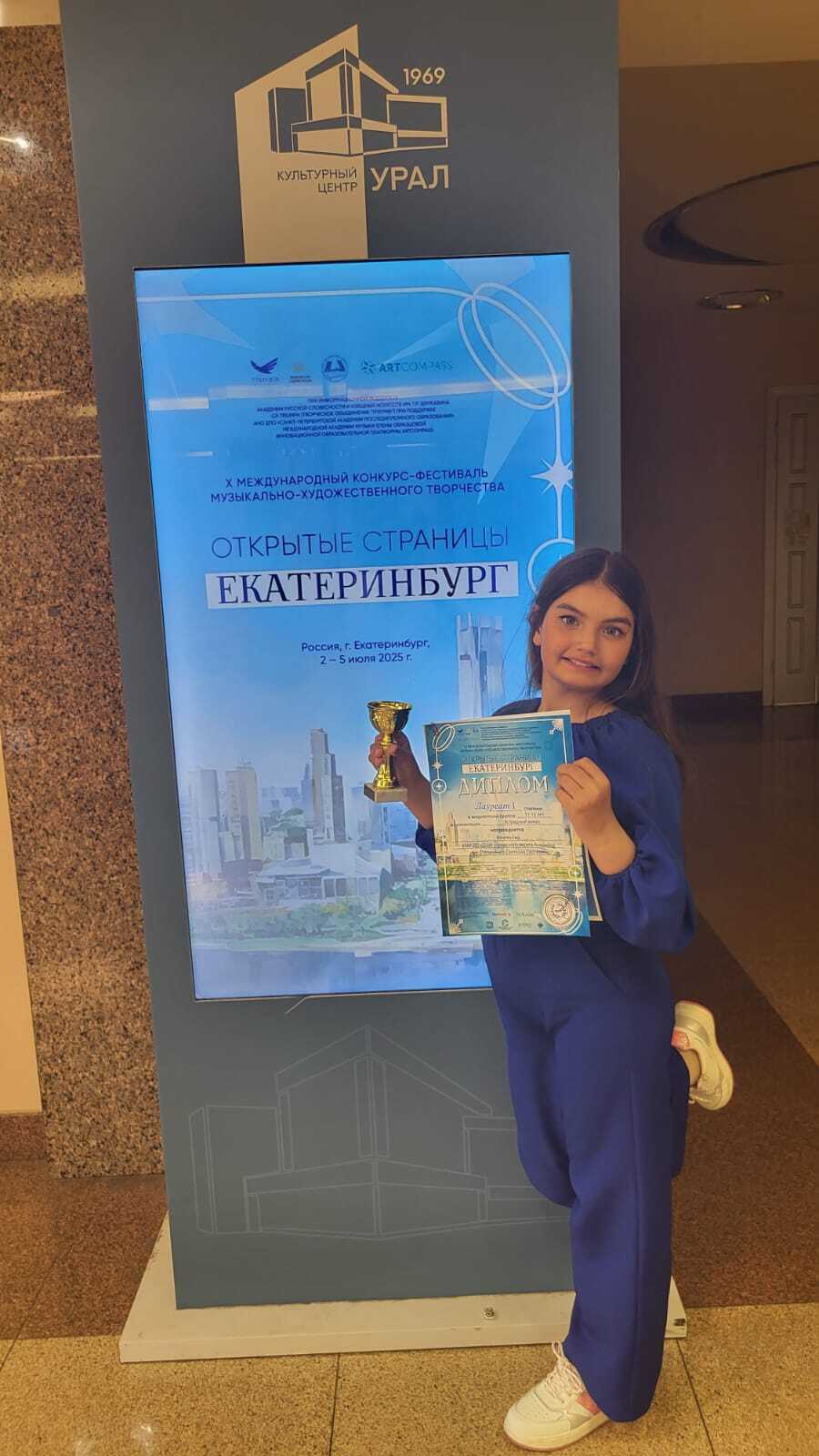 Поздравляем с победой! В Екатеринбурге завершился X Международный конкурс-фестиваль музыкально-художественного творчества «Открытые страницы», и у нас отличные новости! Вачева Ева стала победителем, покорив жюри своим исполнением песни «Родина». Огромная благодарность преподавателю Степаненко Светлане Сергеевне за мастерство и вдохновение, которые она передает своим ученикам! И это ещё не всё! Ева получила приглашение на участие в V Международной премии в области культуры и искусства «START ЗВЕЗДЫ», который пройдёт с 20 по 23 сентября 2025 года в Санкт-Петербурге. Призовой фонд конкурса — 1 000 000 рублей! Даже летом наши талантливые обучающиеся продолжают активно проявлять себя, добиваясь высоких результатов на престижных творческих площадках! Еве желаем новых ярких выступлений, вдохновения и множества будущих побед!