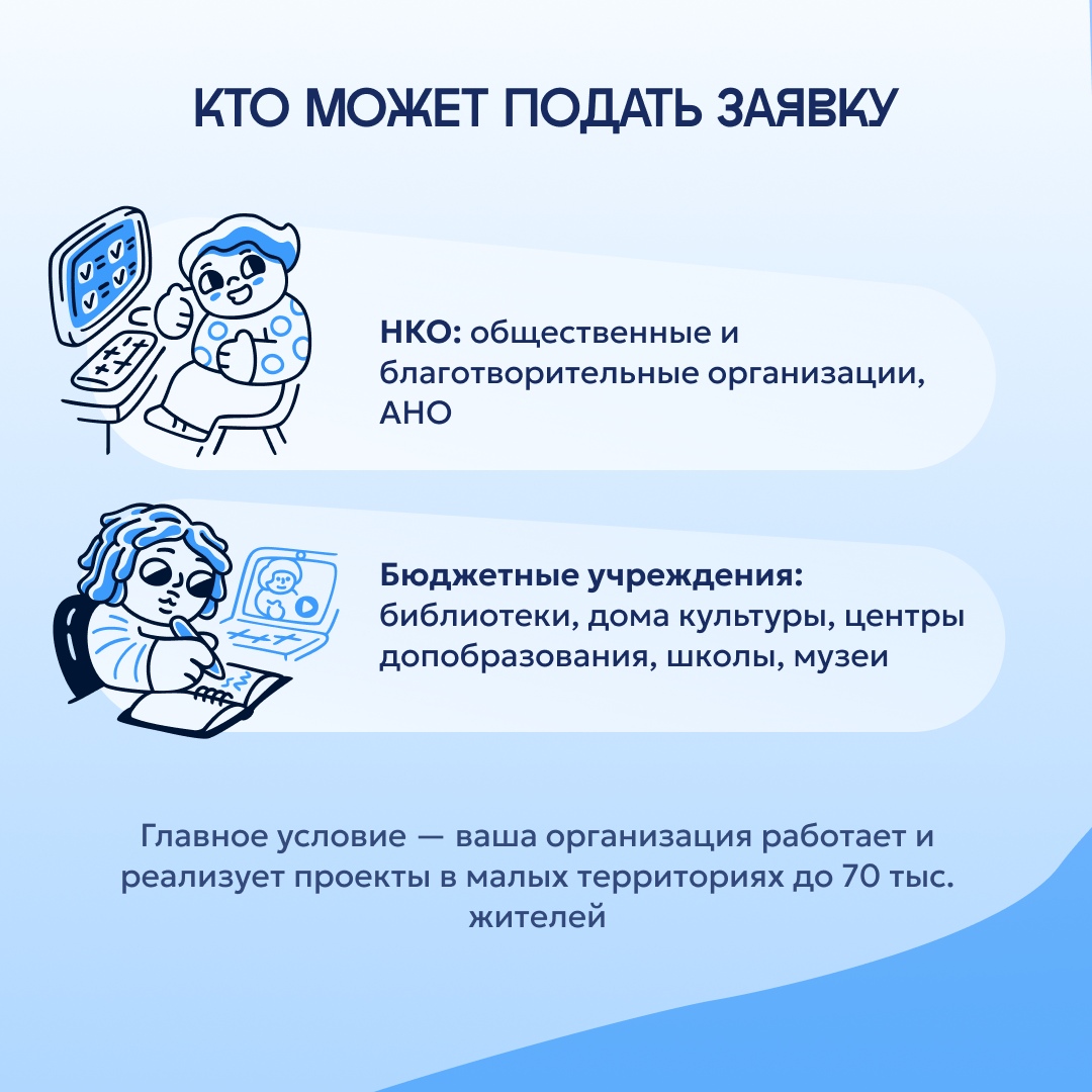 Стартовал приём заявок на конкурс «Среда возможностей» Фонд Тимченко объявляет о поддержке организаций, которые создают проекта для развития и самореализации детей и подростков от 10 до 17 лет в малых городах и сёлах. Главный приз грант до 1 млн рублей и сопровождение проекта на всех этапах. Узнать о проекте и подать заявку можно на официальном сайте конкурса (https://clck.ru/3NzH95). Подробности в карточках.