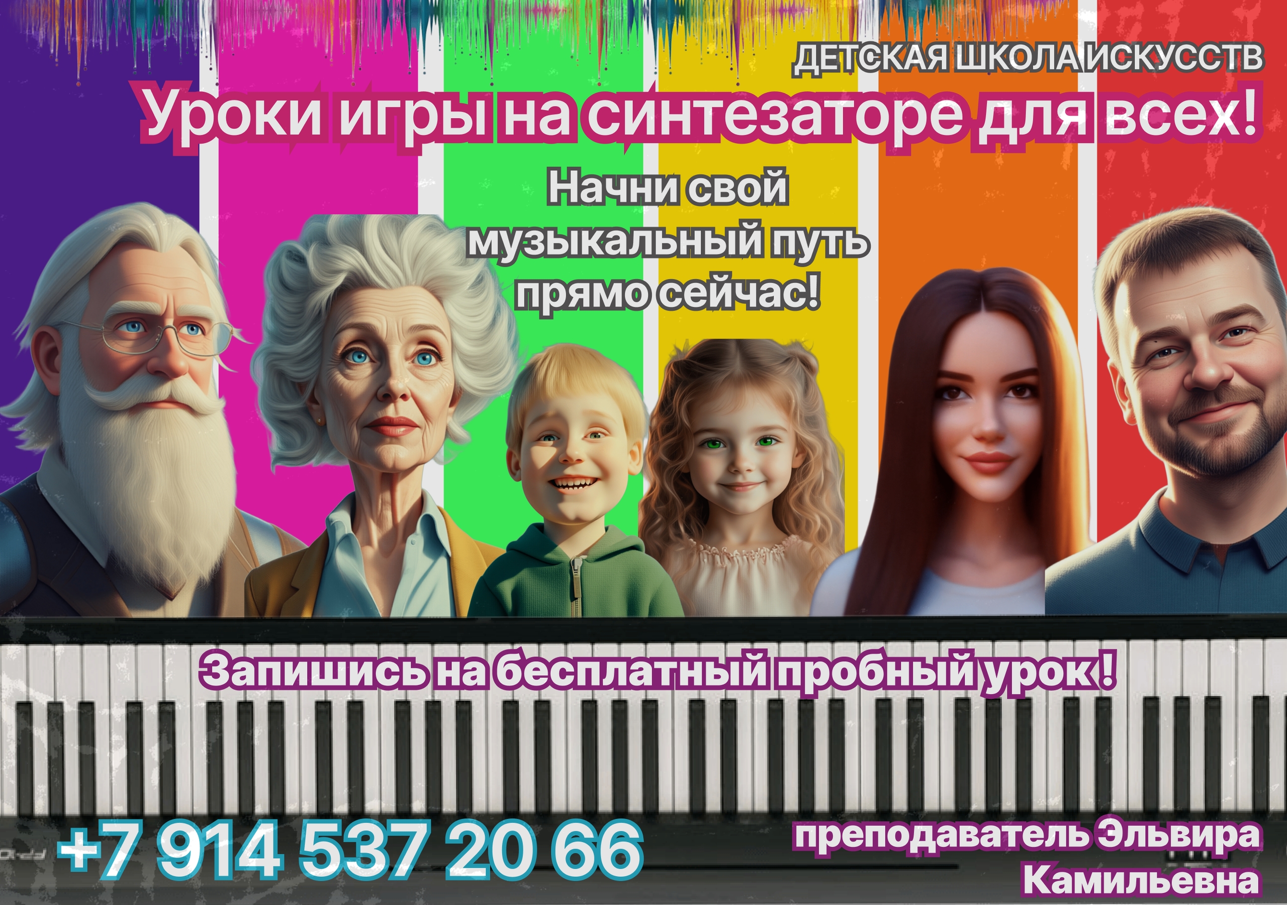 Включи СВОЙ ритм жизни! Стань звездой синтезатора! Мечтаешь играть как любимые артисты? Чувствовать музыку каждой клеточкой? Тогда тебе к нам! Уроки игры на синтезаторе для всех! Дети (от 5 лет): Разбуди свой музыкальный гений! Развивай моторику и креативное мышление в игровой форме! Игра это ключ к обучению! Взрослые (до 99 лет): Никогда не поздно открыть для себя мир музыки! Сбрось стресс, зажги искру творчества и почувствуй себя молодым! Возраст — не помеха, а стимул! Почему именно Детская школа искусств? Осваиваем не только классику, но и актуальные хиты! Учитываем твои интересы и темп обучения! Развиваем музыкальный слух, память и логическое мышление! Улучшаем координацию движений и мелкую моторику пальцев! Искусство это вечно! Даже если ты никогда раньше не играл, мы поможем тебе раскрыть талант! Запишись на бесплатный пробный урок и убедись, что синтезатор это ТВОЙ инструмент! Преподаватель Эльвира Камильевна +7 914 537 20 66